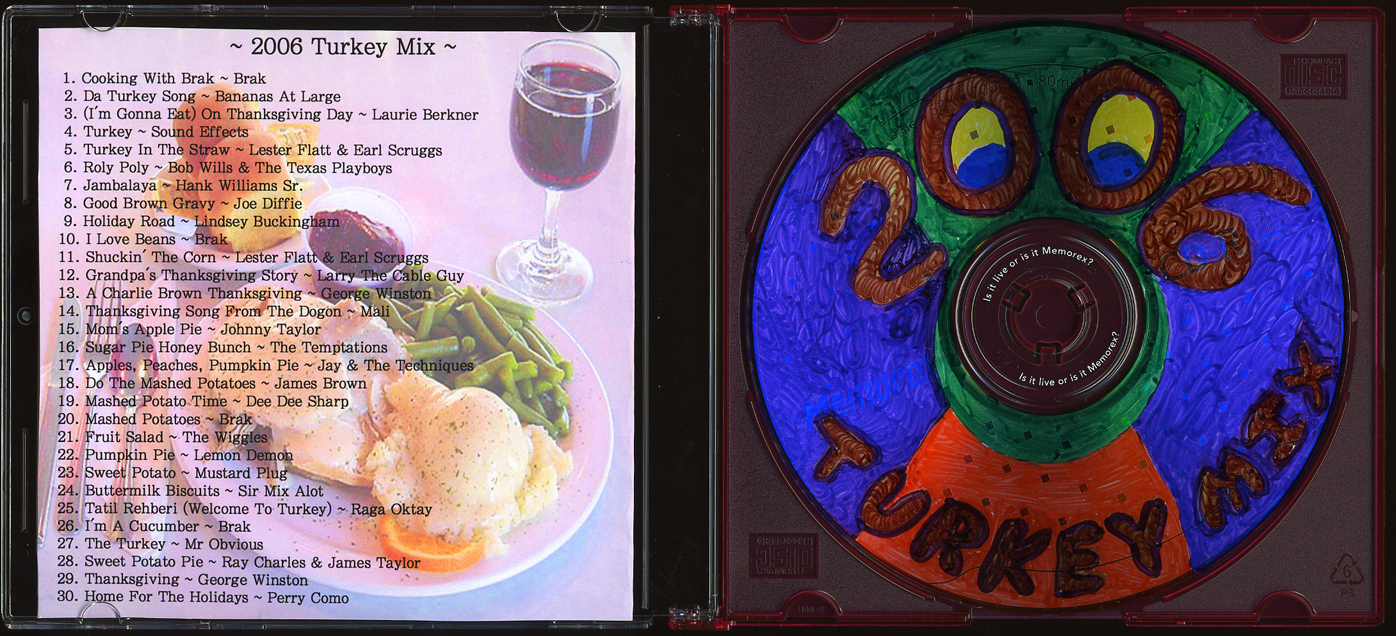 The amount of ‘traditional’ music included in this type of mix depends on the mix maker and the recipient. For example, a typical Thanksgiving mix might contain songs that are traditionally associated with Thanksgiving, such as “Home for the Holidays” or “The Charlie Brown Thanksgiving Theme,” but it might also include “The Mashed Potato” and other songs that refer to typical Thanksgiving foods. Some mix makers will also include less traditional songs about eating or nontraditional Thanksgiving foods (e.g., “Roly Poly” or “I’m A Cucumber”) as a joke.
