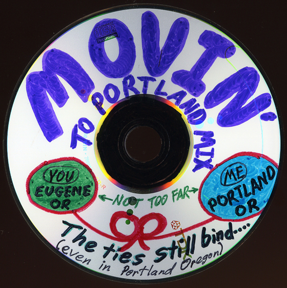A mix I made, called Movin’ To Portland, is a good example of how memory music in a mix can create community. I made it when my girlfriend and I were moving to Portland, Oregon. Our friends were helping us move, and I wanted to thank them and also provide some sense of cohesion and closure to the whole process of moving away. So the songs on the mix were all about Portland, moving, and going home. I Googled images of our new house in Portland and used them along with the information from the rental advertisement on Craig’s List to create the artwork for the CD. We played the CD while we were packing and loading the vehicles. Then I gave a copy to each person, and the CD was played in every vehicle that was used to move us to Portland. We started them all at the same time, so that we would see and hear the same things at the same time as we all drove to Portland. So using the mix to create this group memory was my way of dealing with the pain of moving away from my friends. It was a way of showing that we would still do things together in the future- that this wasn’t the end.
