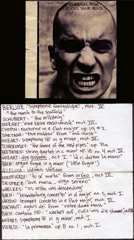 I have this mixed tape that was given to me by this girl fourteen years ago, and it still speaks to me. It still makes me—I can still smell the incense in her room when I listen to this thing, you know? It’s so strange, you know; this tape’s affected me in so many ways throughout my adult life, that I don’t know if I would be the same person if I didn’t have it! (Klaus)1