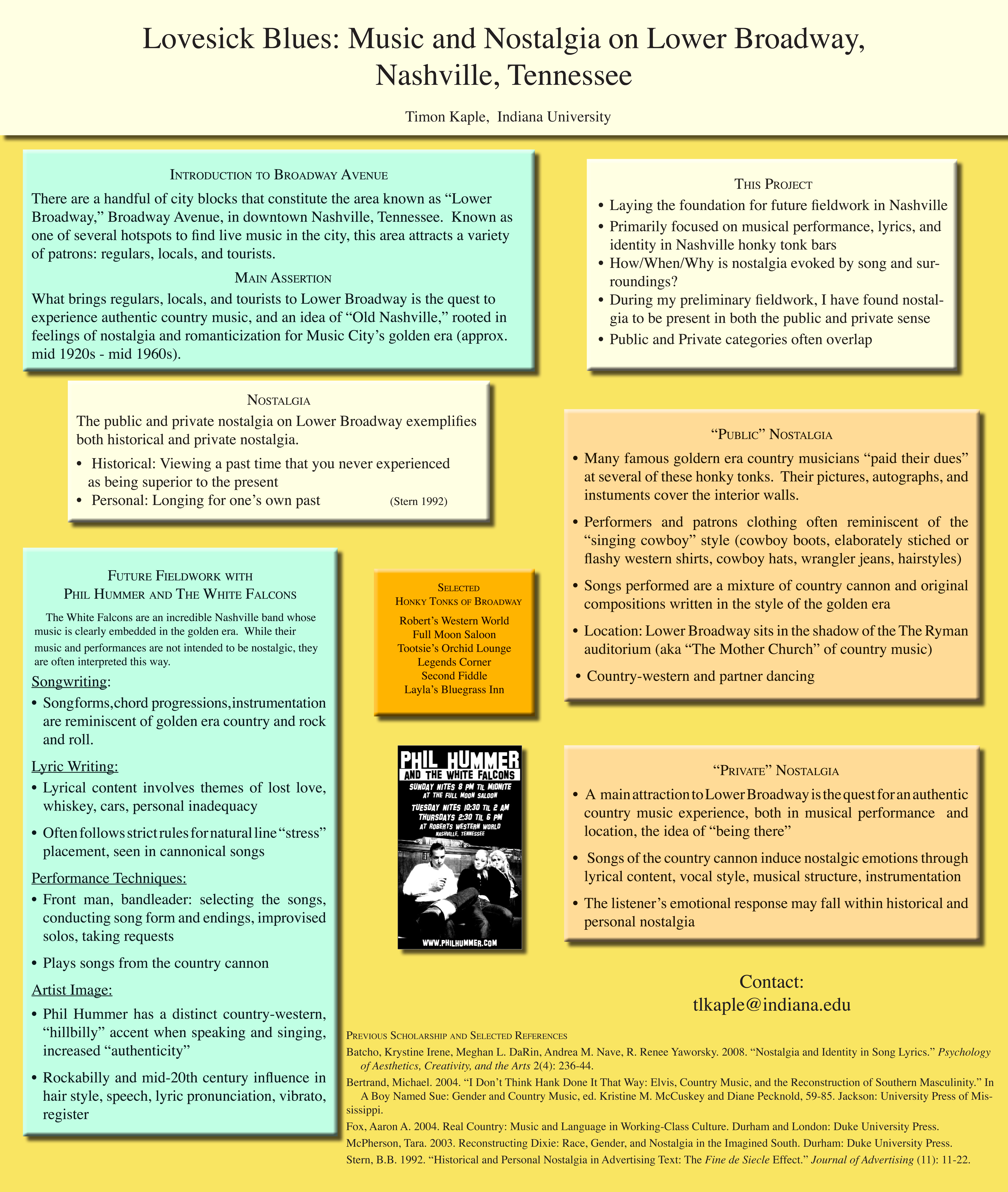 Despite all of the visual stimulation at Robert’s and other honky-tonks, the music is the main source of entertainment and the framework around which collective nostalgia is formed on a daily basis. The canonical country songs induce nostalgia through lyrical content, harmonic progressions, and song structure. I acknowledge that these cognitive connections are not necessarily made by all audience members, as this depends on the individual’s perceptions and background. It is safe to say, however, that the explicitly stated themes in the canonical songs, as well as other aesthetic and sonic features of the music and performance, are likely to generate some kind of relationship between the present-day Nashville and the golden era Nashville. Furthermore, not everything at the honky-tonk is experienced in reference to the golden era. The concept of “Old Nashville” is simultaneously experienced and created, but does not preclude real-time experience. The scope of this poster does not extend beyond illustrating the nostalgic side of authenticity perception as it applies to Lower Broadway and The White Falcons. A more detailed account of my fieldwork in Nashville can be found in my forthcoming masters thesis.