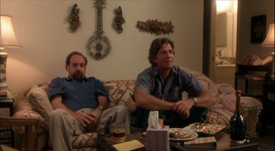On their way to Santa Barbara, Miles insists on stopping at his mother’s house, ostensibly because it’s her birthday. She lives in what appears to be a small condo with mismatched furnishings and tacky, outdated bric-a-brac on the walls, indicative of a suburban middle or lower-middle class lifestyle (see fig 4). He promises Jack they won’t stay long, but when she offers them food, he immediately says, “Yeah, I’m hungry,” and then feigns helplessness as she insists on them staying the night. Jack’s backhanded compliment on the dinner she serves them on mismatched plates, “This is delicious Mrs. Raymond, absolutely delicious…is this chicken?” suggests that Miles didn’t get his epicurean tendencies from her. His real purpose there is revealed when he sneaks upstairs to her bedroom, shooting glances behind him and through the window to make sure Jack is keeping her distracted, and then roots around in her dresser until he finds a can of Ajax. He expertly twists off the bottom and a roll of hundred dollar bills wrapped in rubber bands slides out. He peels off at least a thousand dollars before re-wrapping the bills and returning them to the can. The habitual nature of his reliance on his mother to support his expensive tastes is further reinforced when he returns to the table and she asks in an indiscreet whisper, “Do you need some money?”(Payne 2004).