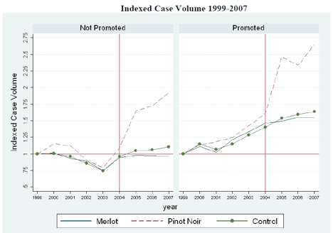 Figure 2 Volume of red wine sales indexed to their 1999 sales volume. “Promoted” includes any wine advertised in mailers, featured in in-store displays, or offered at temporary price reductions of 5% or more. Regression analysis showed that the differences in the growth rate of Merlot and Pinot Noir were statistically significant for both promoted and non-promoted wine. (Cueller et al. 2008. “The Sideways Effect: A Test for Changes in the Demand for Merlot and Pinot Noir Wines.” American Association of Wine Economists Working Papers No. 25 <http://ageconsearch.umn.edu/bitstream/44086/2/ AAWE_WP25.pdf> (accessed July 6, 2009).