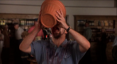In one especially telling scene, Miles gets so desperate for a drink, he actually drops the pretense of wine snobbery. Mid-way through a visit to a tasting room at a big commercial vineyard whose wine he describes as “rancid tar and turpentine bullshit,” he receives a voicemail alert. He walks into the parking lot to listen to the message, which turns out to be from his literary agent. She says that the publisher who had been interested in his novel has decided to pass and that she doesn’t think she’ll be able to find another one. Devastated, Miles marches back into the tasting room, steps up to the bar and demands a pour. He downs it, just like Jack at the first tasting room, and says, “Hit me again.” He downs the second just as quickly and exasperatedly asks the pourer for a full glass, offering to pay. When the man refuses, telling him first that “this is not a bar, it’s a tasting room” and then suggesting that he buy a bottle and go drink it in the parking lot, Miles grabs the bottle out of the man’s hand and fills his glass nearly to the brim. The pourer grabs the glass and they struggle over it, spilling the wine in the process. Miles is momentarily dejected but then glances at the spit bucket sitting on the bar—full of the expectorated tastings of dozens of strangers. He grabs it, and pours it into his mouth (and all over his face and shirt) as the other people in the tasting room groan in disgust (see fig. 6).
